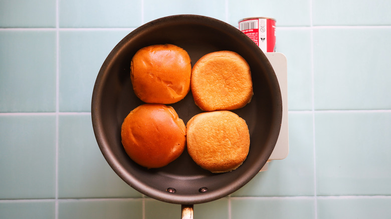 - Heat a nonstick pan over medium heat. Toast the brioche buns until golden brown. Remove and set aside.