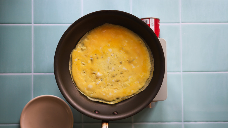 - Pour half the eggs into the same pan and swirl to spread evenly. Cook over low heat until set.