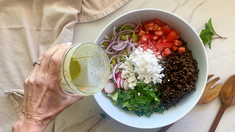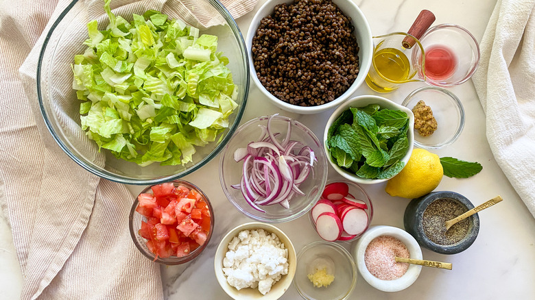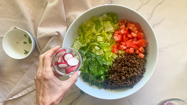 - Add the romaine, remaining chopped mint, lentils, tomatoes, radishes, red onion, and feta cheese to a large bowl.