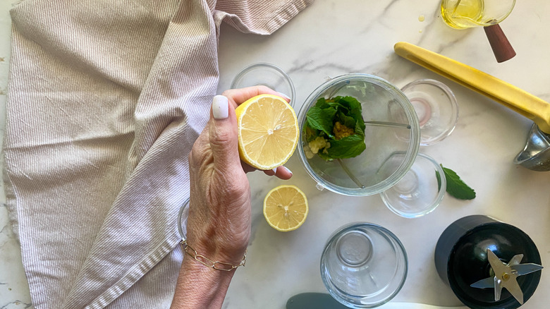 - Add the olive oil, vinegar, lemon juice, garlic, ¼ cup mint leaves, mustard, salt, and pepper to a small blender.