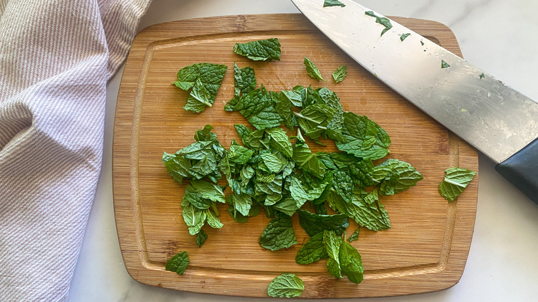 Add the olive oil, vinegar, lemon juice, garlic, ¼ cup mint leaves, mustard, salt, and pepper to a small blender.