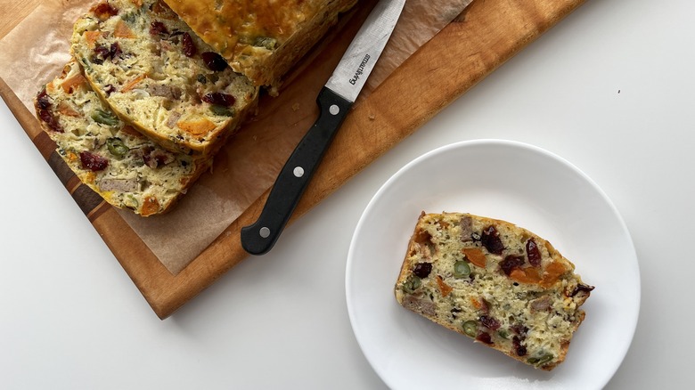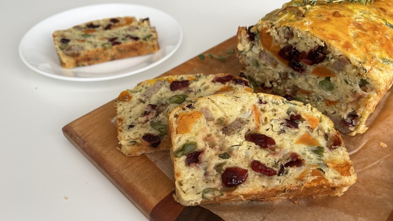 Thanksgiving-in-a-loaf bread, inspired by a French dish called gateaux sale, is filled with all the favorites: sweet potatoes, beans, cranberries, and turkey.