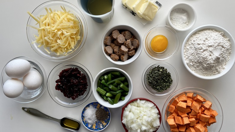 To make the bread itself, you'll be using flour, baking powder, eggs, salt, pepper, and chicken broth. Add-ins include a sweet potato, an onion, thyme, sage, gruyère cheese, turkey sausage, dried cranberries, and frozen green beans; while you're also going to need olive oil and butter for cooking.