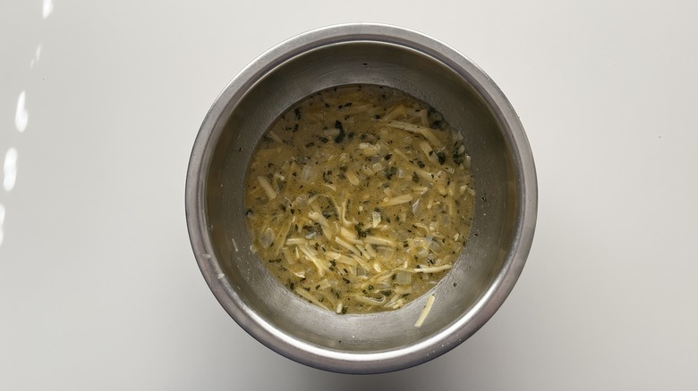 - Add the sauteed onions, grated cheese, and chicken broth.
