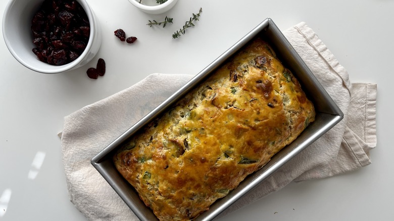 While some recipes are designed to use up Thanksgiving leftovers after the holiday, others can provide a sneak preview of the festivities to come. Such a dish is this Thanksgiving-in-a-loaf quick bread, something that developer Tess Le Moing says is inspired by a French recipe called gateaux sale, or savory cake.