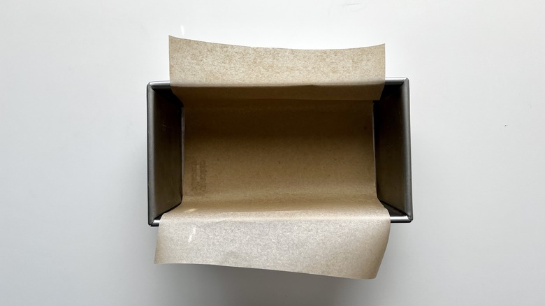 - Line a loaf pan with parchment paper overlapping the sides.