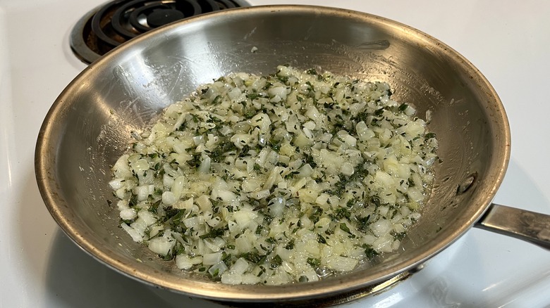 - Stir in the thyme and sage and cook until fragrant. Transfer to a bowl and let cool.