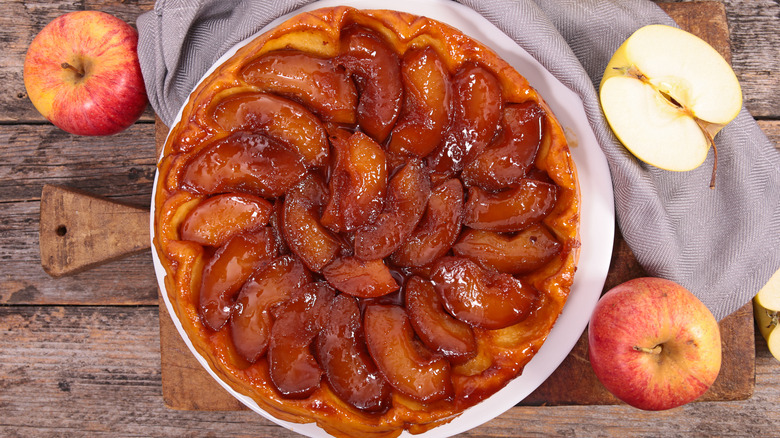 You can stir some salt directly into your caramel or incorporate it as a garnish, as Palazzo does. "I like adding some finishing salt once my tatin is unmolded — just a small pinch," notes Palazzo. While kosher or fine sea salt is best for dissolving into your cooked caramel, finishing salts are a specific category of coarse or flaky salts. Examples include Maldon sea salt, fleur de sel, and Himalayan pink salt. These unrefined, flaky salts add a final flourish of crunchy texture and a burst of flavor to a dish. Using finishing salts is an easy way to add a final layer of flavor to your apple tarte tatin that will have your guests sitting back and taking notice.
