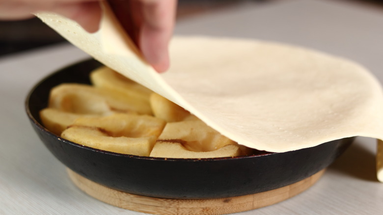 Once the apples are sufficiently cooked, they're ready to be covered with a pastry crust. Palazzo uses both puff pastry and pie dough when making apple tarte tatin, but she notes, "For a more professional tatin, I typically will use puff pastry." While she enjoys making puff pastry from scratch, Palazzo says that store-bought puff pastry works great, too. The most important thing to remember, she advises, is to "make sure when you're working with your dough that you keep it cold and dock the pastry." Docking involves pricking the surface of the pastry with a fork or a dough docker. This technique keeps the pastry from puffing up too much by releasing steam as it bakes.