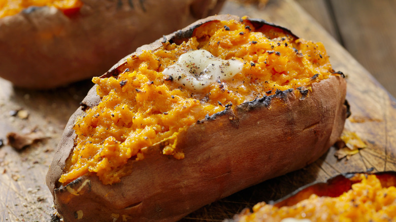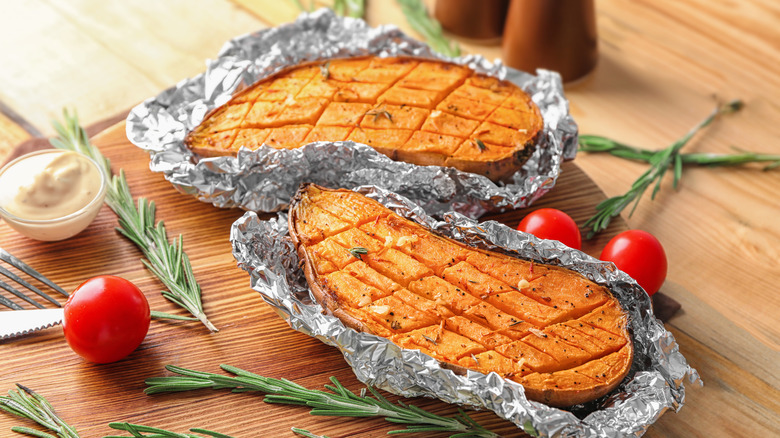 Roasting sweet potatoes is a breeze, right? Simply put them in a hot oven for an hour to be rewarded with a yummy, piping-hot spud with tangerine-colored flesh that's filling, delicious, and comforting. Having said that, there's an effortless way to boost their flavor and texture even further by employing a quick hack that doesn't require any fiddly bits of equipment. All you need are a few tablespoons of water and a sheet of aluminum foil to bundle up your taters before you bake them to make the fluffiest, creamiest sweet potatoes ever.