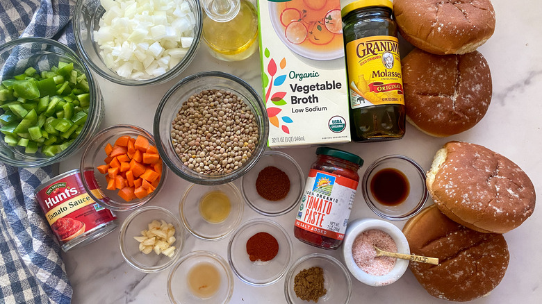 To make this recipe, start your store visit in the produce aisle and pick up an onion, green pepper, garlic, and carrots. Then hit up the dry goods area and grab some brown lentils. The rest of the ingredients you might have in your pantry: vegetable broth, tomato sauce, tomato paste, soy sauce, molasses, apple cider vinegar, liquid smoke, and hamburger buns. "If you have trouble finding liquid smoke, you can omit this ingredient as long as you are using smoked paprika to give us that smoky flavor," Hahn shares.