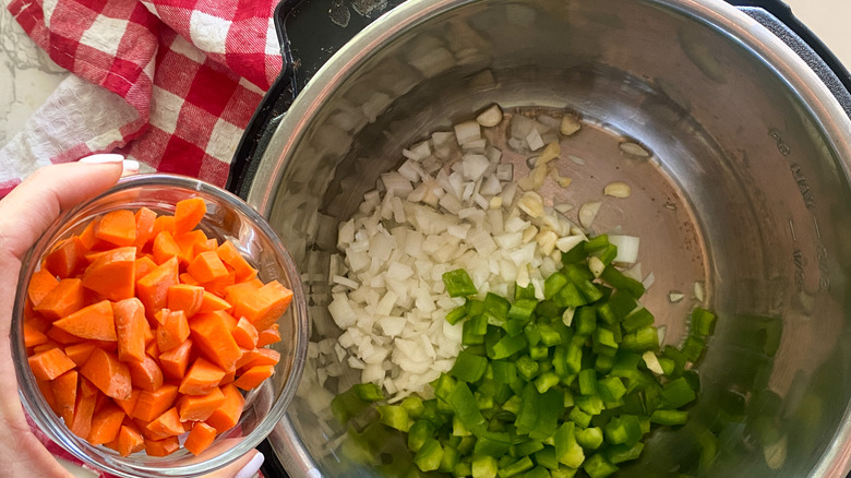 - Add the onion, green pepper, garlic, and carrots and saute for 5 minutes stirring frequently.