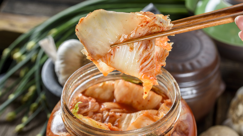 Kimchi is a traditional Korean food made of salted, fermented vegetables, most often a combination of napa cabbage, salt, garlic, ginger, scallions, fish sauce, and red chili flakes. The word "kimchi" actually comes from the Korean word "chimchae," meaning "vegetables soaked in brine." The resulting dish is a spicy, sour, pungent, tangy, umami-forward condiment that your tuna melt has been crying out for. The acidity of the kimchi meets the savory umami-ness of the tuna for a savory flavor bomb that feels oh-so-right. In fact, countless dishes already pair tuna with kimchi, like chachi-kimchi-jjigae, a kimchi stew with tuna, which is a traditional Korean comfort food.