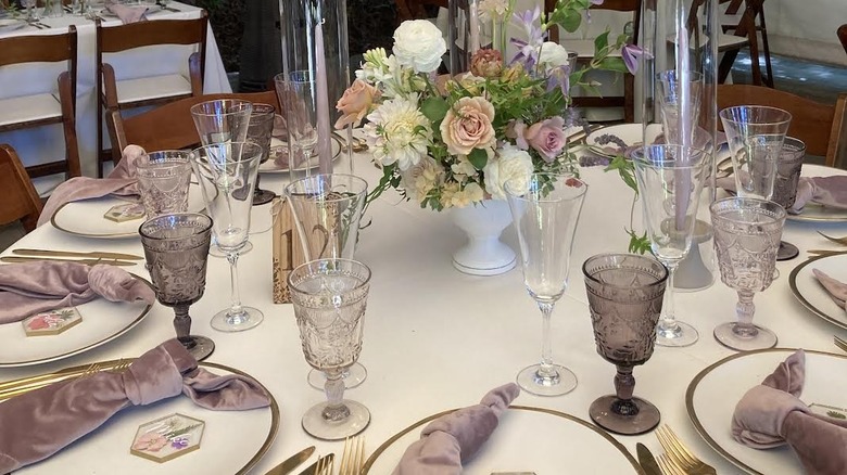 "You could look at the table and it could just be so complicated that you don't enjoy looking at it; we see this a lot when people go too wild on things like color schemes," said Balshaw. "I absolutely recommend no more than three colors. Start with a lighter color on your base linen because dark colors make it feel more deep and moody. I like to pull in the darker color after, with an element of like ... a dark purple, then bring in a brighter pop of a color like lavender with the napkins."