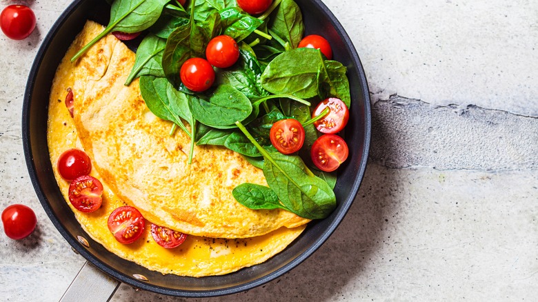 But that's not all you'll achieve by scrambling your eggs first. Using a whisk (or just a fork) adds air into the mixture, which makes for a light, pillowy consistency in your final product. It may be tempting to stop whisking as soon as your eggs are evenly blended but keep going for at least 30 seconds to achieve as much froth as possible. If you're making breakfast for a crowd (or just a big family), you can use an electric beater to minimize the muscle work required. Including this step in your omelet-making process has another benefit, too — if you want to season your eggs, you can do so before scrambling to ensure the spices are evenly distributed throughout.