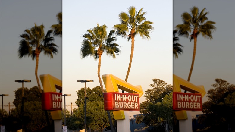 If you've stopped by an In-N-Out location lately, you've probably noticed the presence of two crossed palm trees planted right outside the building. A lot of locations across the country — and especially in the areas that are hospitable to palm trees — bear this marker. It's often made with two 20-foot Mexican fan palm trees artificially crossed at a height of 10 feet.