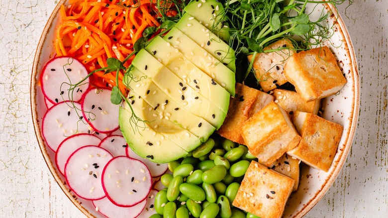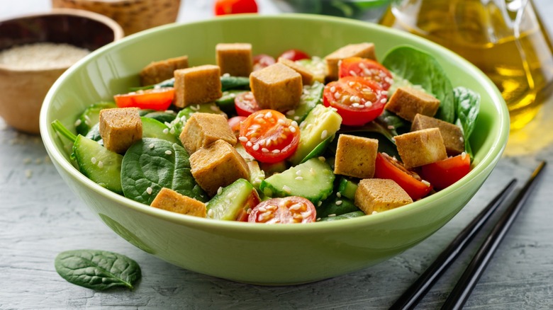 Once you've mastered the salad recipe, experiment with flavor variation by preparing your tofu with jerk spices, maple sesame seasoning, or a flavorful bulgogi marinade, and try plating the ingredients in separate sections instead of mixing them for a rice bowl presentation. Serve with extra dressing on the side to let diners satiate their own palates. After you've mastered the tricks for making extra crispy tofu and have tried this meat-free meal for yourself, you may not notice the absent chicken meat in your avocado salad.