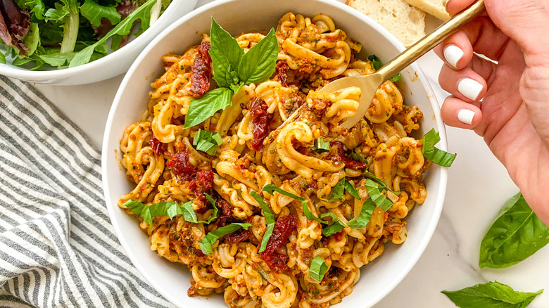 Alongside the sun-dried tomatoes, the recipe integrates basil, pine nuts, garlic, olive oil, and lemon juice with some salt and pepper to make the delicious pesto. The prep couldn't be easier — all you have to do is throw the ingredients in a food processor, blend until smooth and thick, and it's good to go. The result is a sweet and tangy take on a classic pesto thanks to the full flavor of sun-dried tomatoes. The Tasting Table recipe pairs the pesto with only the pasta and some fresh basil and extra pine nuts to taste, but there are plenty of other pasta recipes that the sun-dried tomato pesto will work well with.