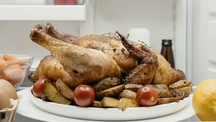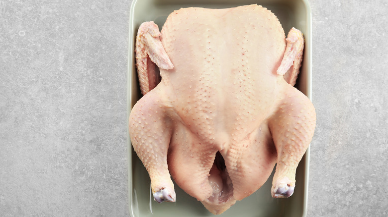 Just because your turkey is fully thawed doesn't mean you have to cook it right away. If you got an extra jump on your defrosting, the USDA assures that it's safe to leave your thawed bird in the fridge for up to two days. While it's defrosting and right up until you're ready to cook it, keep the turkey in the package you bought it in. You may also want to place it in a roasting pan so that any excess moisture doesn't get all over your fridge. Try to keep the pan away from any other food — if juices do leak out from your raw poultry, you don't want them spilling all over the rest of your refrigerated goods.