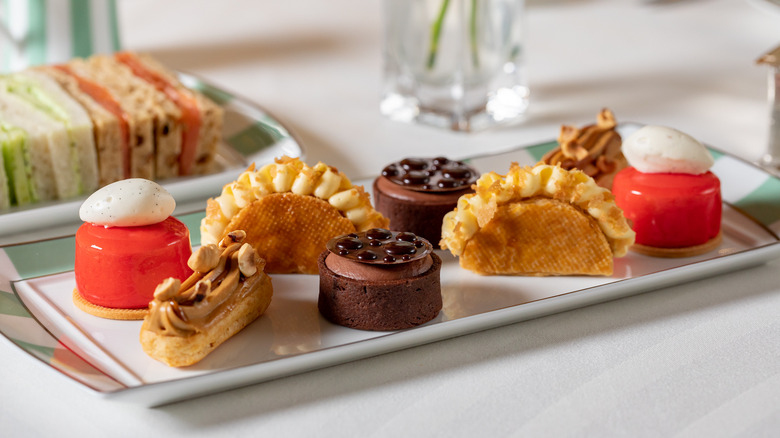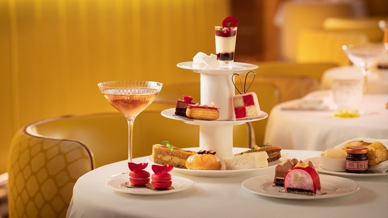 TĪNG's afternoon tea offers include a signature cocktail or mocktail, a selection of classic finger sandwiches and scones, and a delightful array of sweets like raspberry plum cake and layer cake with pistachio and sour cherries.