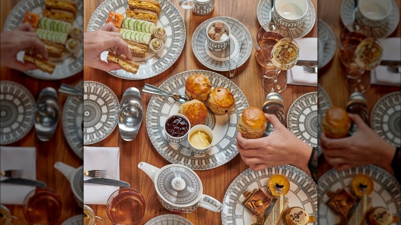 Finger sandwich varieties include cheddar and camomile scones, smoked salmon with brown shrimp and rock samphire, and ham with truffle and Parmesan. The pastry selection features a red-fruit mille-feuille and a quince and yogurt mousse.