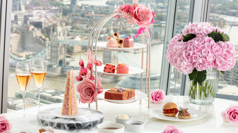 Tea is served with a flower-topped tiered tray of savory finger sandwiches and tarts made with seasonal produce. Sweeter offerings include rich chocolate brownies and classic Victoria sponge cakes complete with fresh strawberries and a light buttercream.