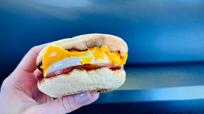 A breakfast sandwich is essentially a sandwich that is eaten for breakfast, but more than that, it's typically a sandwich filled with the kinds of eggs, meat, cheese, condiments, and veggies usually associated with the morning meal. This can be as simple as plain eggs between two pieces of toast or as decadent and drool-worthy as you can dream up. It's said that the idea of a breakfast sandwich started in London in the 1800s when fried eggs, meat, and cheese sandwiched in a roll called a bap were sold to workers to fuel them for a day in the factory. The tradition arrived in the US during the Industrial Revolution, and the popularity of this kind of breakfast really took off when Herb Peterson invented the EggMcMuffin for McDonald's in 1972.