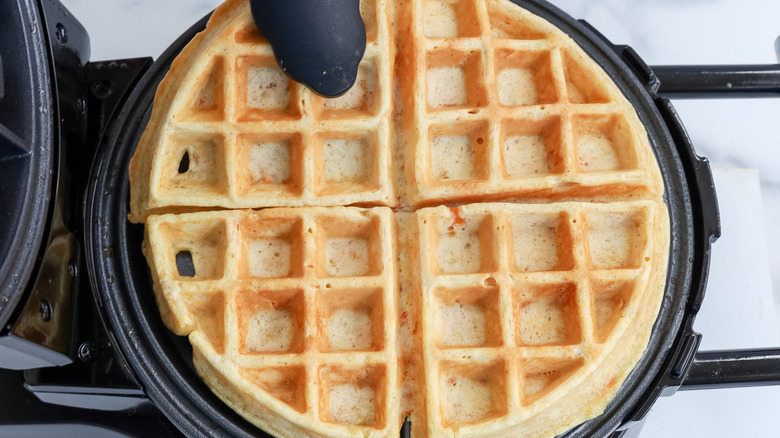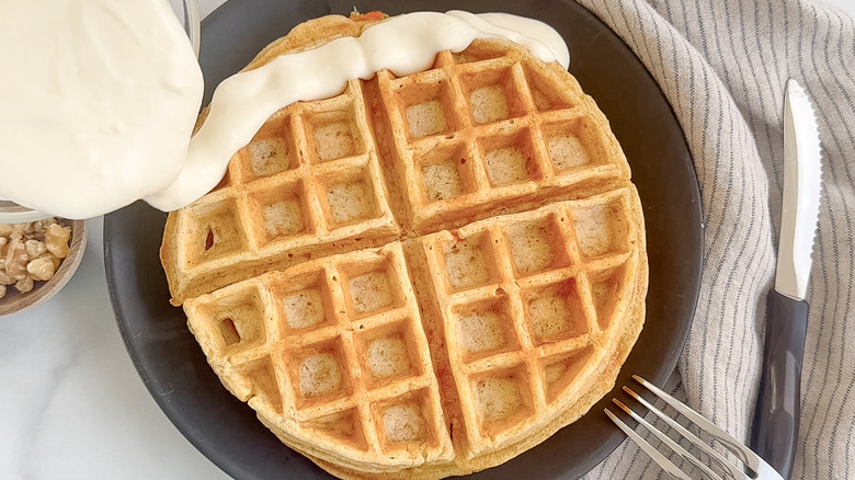 Even if you aren't typically keen on sweet breakfasts, you'll be thrilled to learn that these waffles don't go too overboard with the sugar. The waffles themselves only feature a touch of sugar, while the cream cheese frosting effortlessly balances sweetness with cool, creamy flavors and the tang of cream cheese. Combined, the spiced waffles and creamy glaze make for a delightful twist on your run-of-the-mill waffles, and best of all, you can whip them up right in your own kitchen.