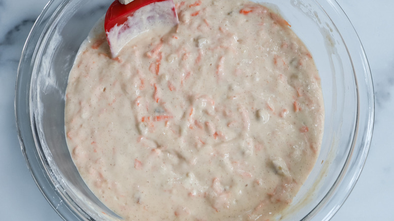 - Add the grated carrots and walnuts to the bowl and mix together until just combined.