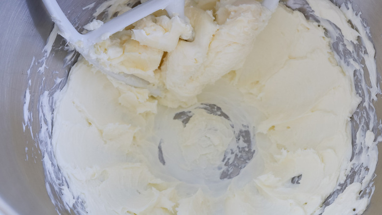 - Add the cream cheese and softened butter to a large bowl. Use a stand mixer or electric mixer to beat them until fluffy.