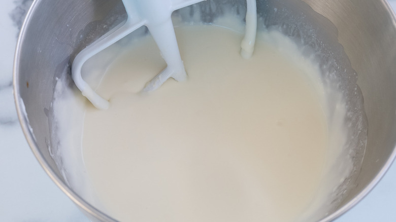 Add the vanilla extract and confectioner's sugar to the bowl, and then pour in the heavy cream. For a thicker consistency use ¼ cup of heavy cream and for a glaze use ½ cup. Beat until smooth.