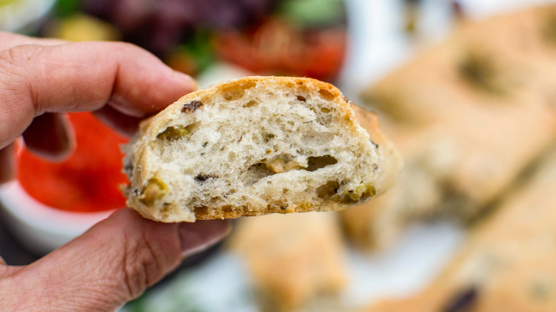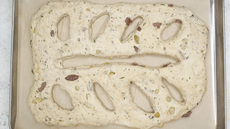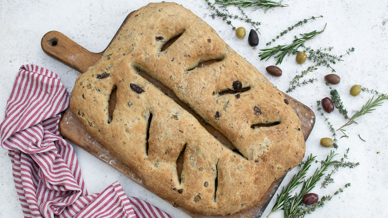 Fougasse, a traditional French bread known for its distinctive leaf design, is one of French recipe developer Annabelle Randles' favorite kinds of bread. As she explains, it conjures up memories of summer holidays in the South of France. Fougasse originates from the Provence region and in its simplest form is made from bread flour, yeast, water, and olive oil. It has many variations, and for this recipe, Randles is using olives and herbs for extra flavor. This is an easy and straightforward recipe that is sure to impress guests around the dining table.