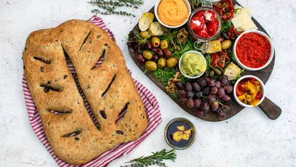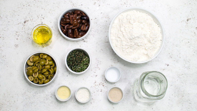 Gather the ingredients for this Mediterranean herb and olive fougasse