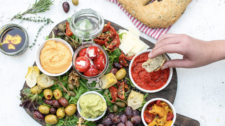 Randles also likes to add a variety of olives, mixed nuts, salad leaves, sundried tomatoes, chargrilled peppers, capers, stuffed cherry peppers, and roasted artichoke hearts, as well as extra virgin olive oil and balsamic vinegar for dipping.