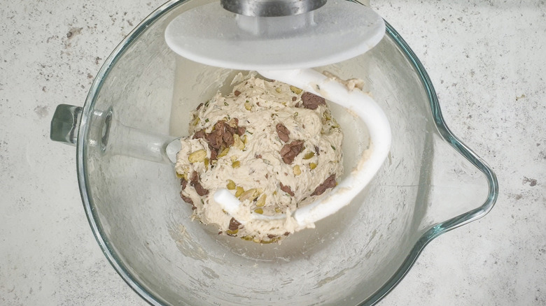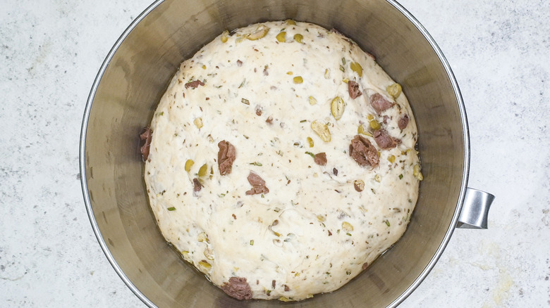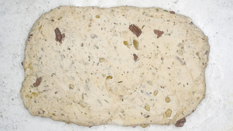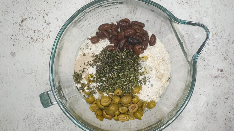 - In a mixing bowl, combine the flour, yeast, salt, olives, herbs, water, and olive oil.