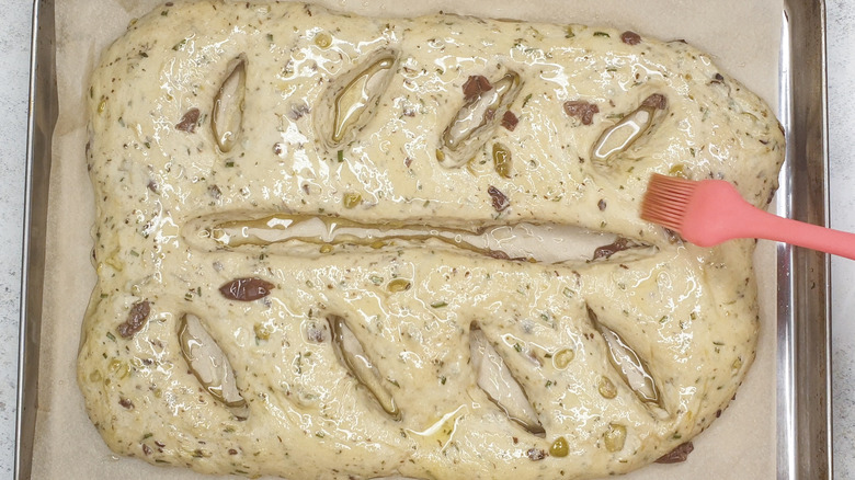When you're ready to use the frozen fougasse, remove it from the freezer and let it thaw at room temperature. Thawing times will vary depending on the size and thickness of the fougasse as well as the ambient temperature. You should count 1 to 2 hours for smaller pieces and up to 4 hours for a whole fougasse. To restore the fougasse's freshness, Randles advises reheating it in a preheated oven at around 350-375 F for about 10 minutes.