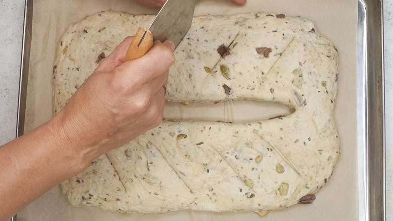- Using a bench scraper or pizza cutter, cut the fougasse in the middle leaving a 1-inch border at the top and bottom. Cut 4 diagonal slots on each side, leaving a 1-inch border on each side.