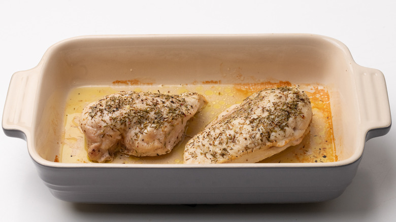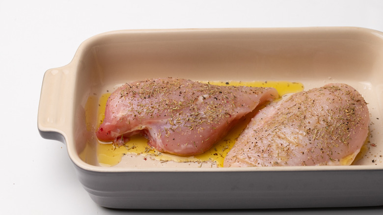 - Arrange the chicken breasts in an oven dish, drizzle with 1 tablespoon olive oil, and season with the thyme, salt, and pepper.