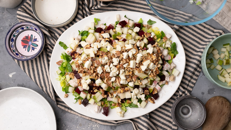 This recipe for chicken, pear, and walnut chopped salad, created by Tasting Table recipe developer Jennine Rye, is a dish that can be enjoyed year-round. Cooling and fresh, but also substantial and satisfying, this salad will fulfill even the fussiest of eaters. This dish is a feast of flavors: Packed full of roasted chicken breast for a big hit of lean protein, as well as sweet pears, toasted walnuts, beets, and dolce Gorgonzola. Finished off with a simple and delicious Dijon and maple salad dressing, this salad is anything but boring.