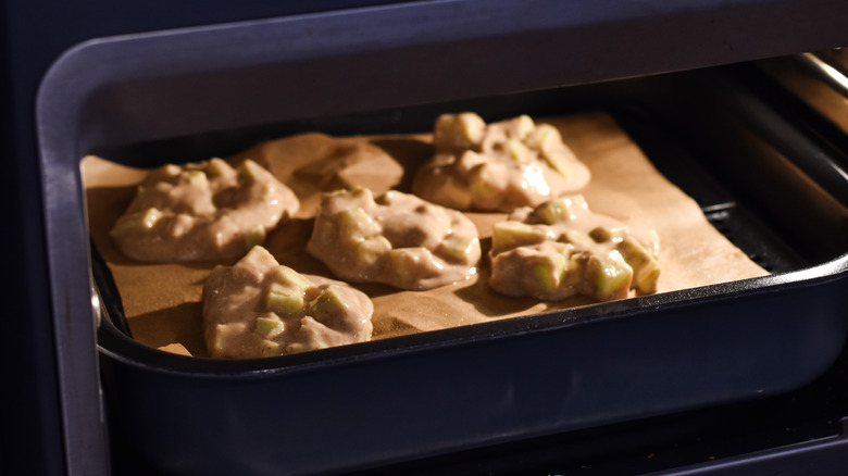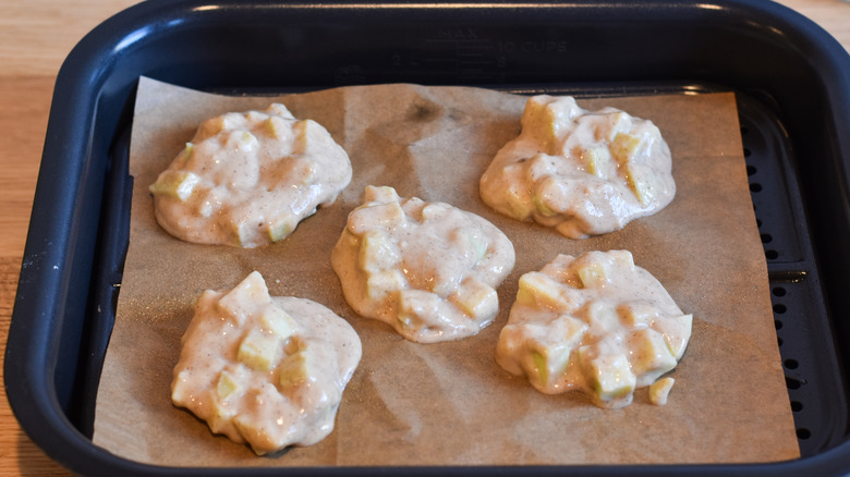 - Dollop ¼ cup of batter onto the lined tray. Repeat, leaving a ½-inch of space between each.
