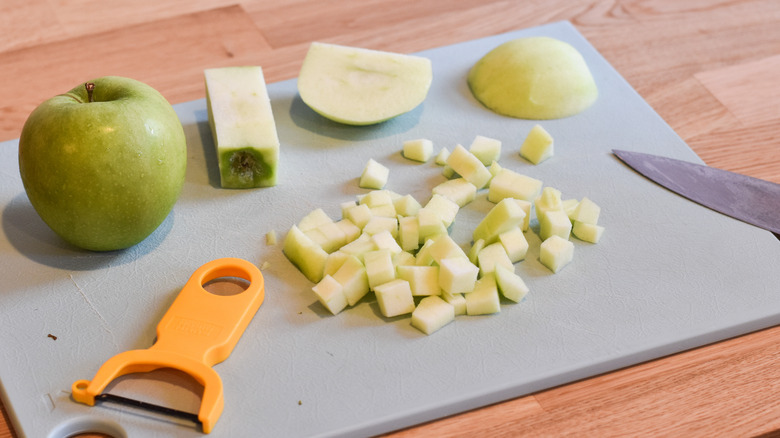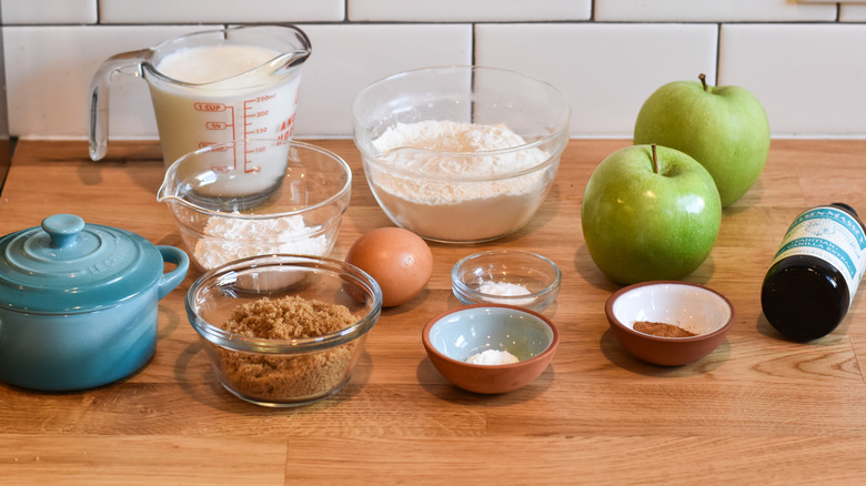 Let's gather the ingredients together to make a batch of air-fried apple fritters. Of course, you'll need apples — two Granny Smith apples are ideal here, but any other variety will also work fine. A cup of buttermilk will keep these fritters moist, give them a doughnut-like flavor, and also counter some of the sweetness from the sugar since it's tangier than regular milk. Brown sugar will also help attain the perfect moisture and sweetness levels. Besides that, you'll need vanilla extract, all-purpose flour, cinnamon, baking powder, and baking soda for the fritter batter. Once the fritters have been air-fried, use a simple mix of buttermilk and powdered sugar to glaze them.