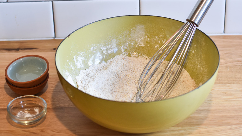 - Add flour, cinnamon, baking powder, baking soda, brown sugar, and salt to a mixing bowl. Whisk to combine and set aside.