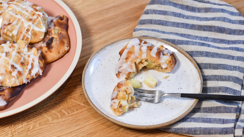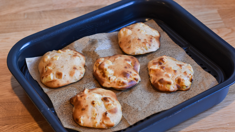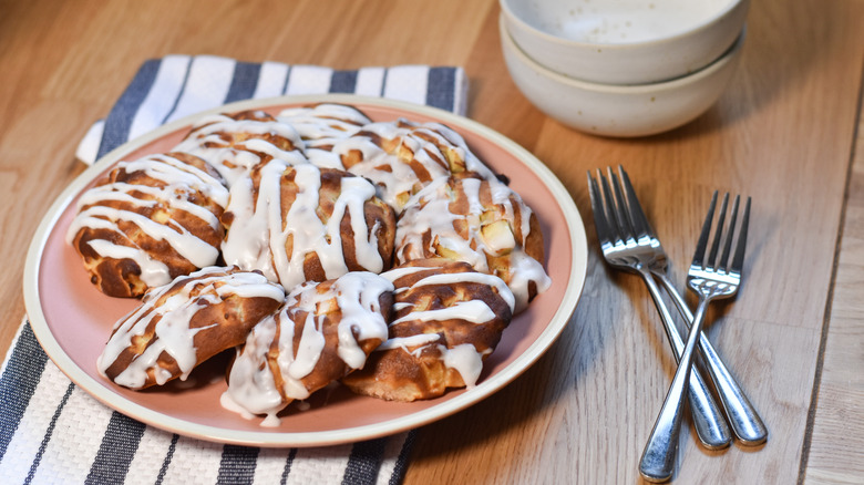 Now that you've made your air fryer apple fritters, you might be wondering what to enjoy them with. They're perfect for dessert after a comforting meal, so of course you can enjoy them on their own, but adding a dollop of cool whipped cream or vanilla ice cream would take them up a notch. For a holiday gathering, apple fritters make an excellent addition to a dessert table. Whip up some other small baked goods, like pumpkin spice cupcakes or 5 ingredient pumpkin cookies, and serve them together on a large platter so guests can have options.