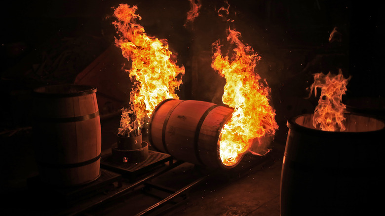 Apart from the ingredients, the most important stage of the distillation process is how the whiskey is aged. Most bourbons use American oak for their barrels, though it's not legally required. What is required is that the barrel is new, meaning it's never been used to age a spirit before. Not only that, but it has to be charred. After the barrel has been assembled, an open flame is used to turn the interior surface of the barrel into a thin layer of charcoal. Some distilleries will subvert this requirement by toasting the barrel instead, which heats the interior without getting it hot enough to form charcoal. Once the bourbon has been placed in the barrel, it must be aged for at least two years. There are subcategories that have other requirements, such as the bottled-in-bond bourbons, which require four years.