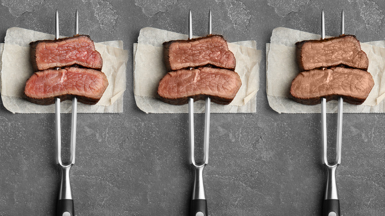 According to the USDA, steak can only be classified as grass-fed if the cattle from which it came grazed exclusively on grasses after weaning. As a result, these factors can directly affect the quality of the meat. For instance, in comparison to beef from cows that were fed a grain-based diet with restricted mobility, grass-fed beef boasts the exact opposite characteristics. Along with its tendency to have a gamey flavor, grass-fed steak is generally much leaner, which is what makes these types of filets so susceptible to overcooking.