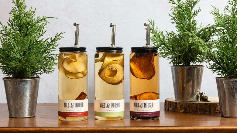 The trio of jars comes with pre-measured ingredients and a pour spout for easy use after the three-day infusion period. It's a simple process and not your typical cocktail. We appreciate the added holiday cheer to spruce up your bar cart with the Merry and Bright Bundle: spiced punch is made with dehydrated cranberry, dehydrated pear, and dried rosemary; the snowed-in kit with dehydrated apples, candied ginger, and cardamon; or the home sweet home blend is dehydrated caramelized apples, molasses, and cinnamon.