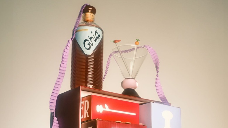 The zero-proof cocktail kit comes with a 500-milliliter bottle of Ghia, a handblown cocktail glass and two stirrers, a pour spout, and branded coasters. The colorful kit feels artisanal and luxurious — not your typical bottle.