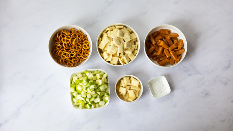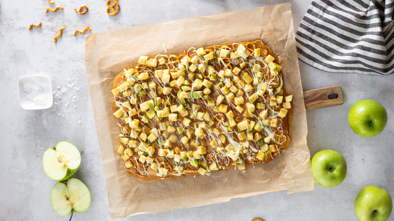 To create this delicious recipe, you will need five simple ingredients: white chocolate, pretzels, chewy caramel candies, green apples, and flaky sea salt. "While apple varieties can often be used interchangably in baking, the green apple in this recipe is incredibly important in providing a tart, fresh, green flavor that helps to balance the sweetness of the other ingredients," Douglas notes, adding, "Patting the apples dry to remove any excess moisture is also integral in ensuring a firm, crisp, chocolate bark."