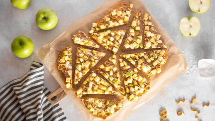 Satisfy your sweet cravings with this irresistible Salted Caramel and Toasted White Chocolate Apple Bark, created by recipe developer Tanika Douglas. At its heart, this dessert showcases the art of transforming white chocolate into a luscious, caramelized base. Douglas' method of toasting the chocolate brings out its rich, golden sweetness and caramel notes, providing a perfect canvas for this moreish treat.
