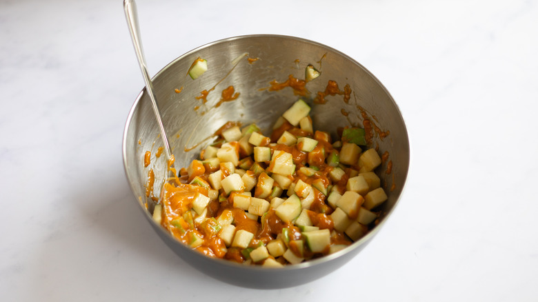 - Place the apple cubes into a second large heatproof bowl. Remove excess moisture with paper towels.